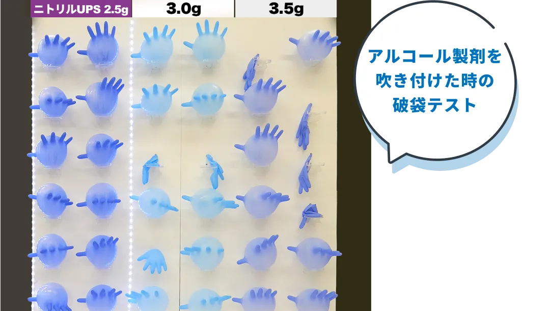特に、ニトリルグローブシリーズでは、食品現場で使用される多様なアルコール製剤に対応できるよう、「独自基準」の耐性検査を実施。高濃度エタノールやpH酸性域での厳しい検査をクリアした商品をお届けしています。