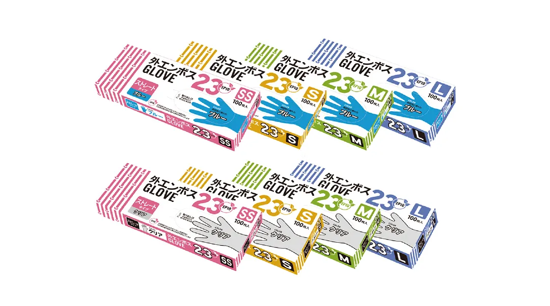 商品そのものだけでなく、パッケージにも工夫を凝らし、例えば手袋シリーズではサイズごとに色分けしたパッケージを採用。一目でサイズが分かり、現場での取り違えを防ぎます。