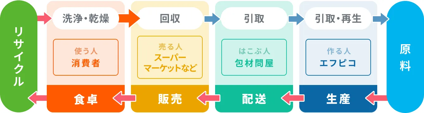 エフピコは1990年、使用済み食品トレーをスーパーマーケットの店頭で回収し、リサイクル工場へと運んで新たな製品として生まれ変わらせる「エフピコ方式リサイクル」を開始し、30年以上にわたって推進しています。
