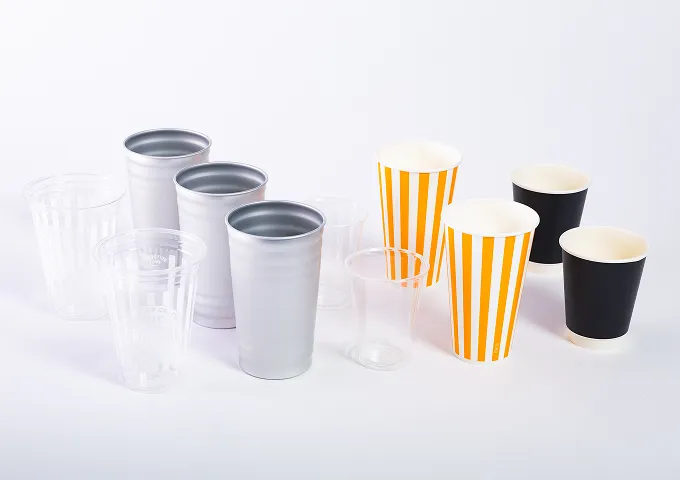 定番のクリアコップ、紙コップの他に特殊コーティング加工により温冷両用に対応可能な高機能カップなど、専門性の高い商品も取り揃えています。