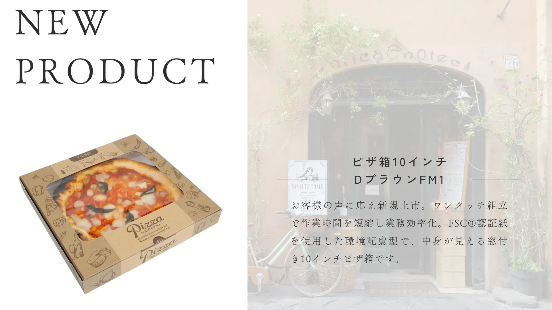 プライベートブランド(PB)の新商品として、組立作業性を大幅に向上させた「ピザ箱10インチ窓付デリシャスブラウンFM1」を2025年9月より発売いたしました。