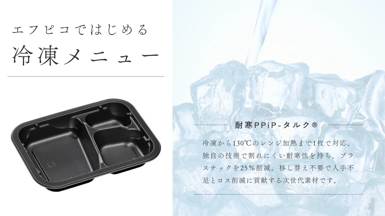 株式会社エフピコのオリジナル素材「耐寒PPiP-タルク®」は、冷凍保存から電子レンジ加熱までを1枚で完結させ、現場のオペレーションの限界を突破します。