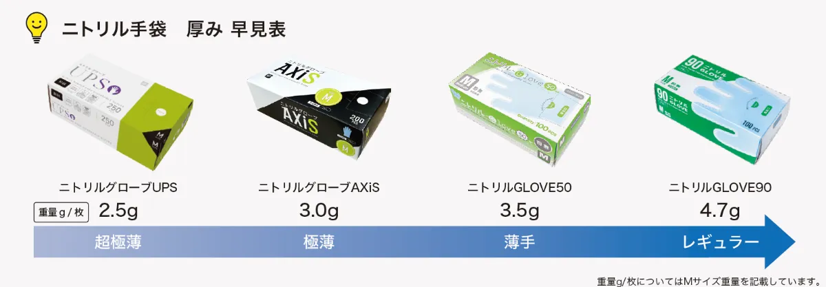 ニトリル手袋を導入する際、最も慎重に判断すべきなのが「厚み(重量)」です。